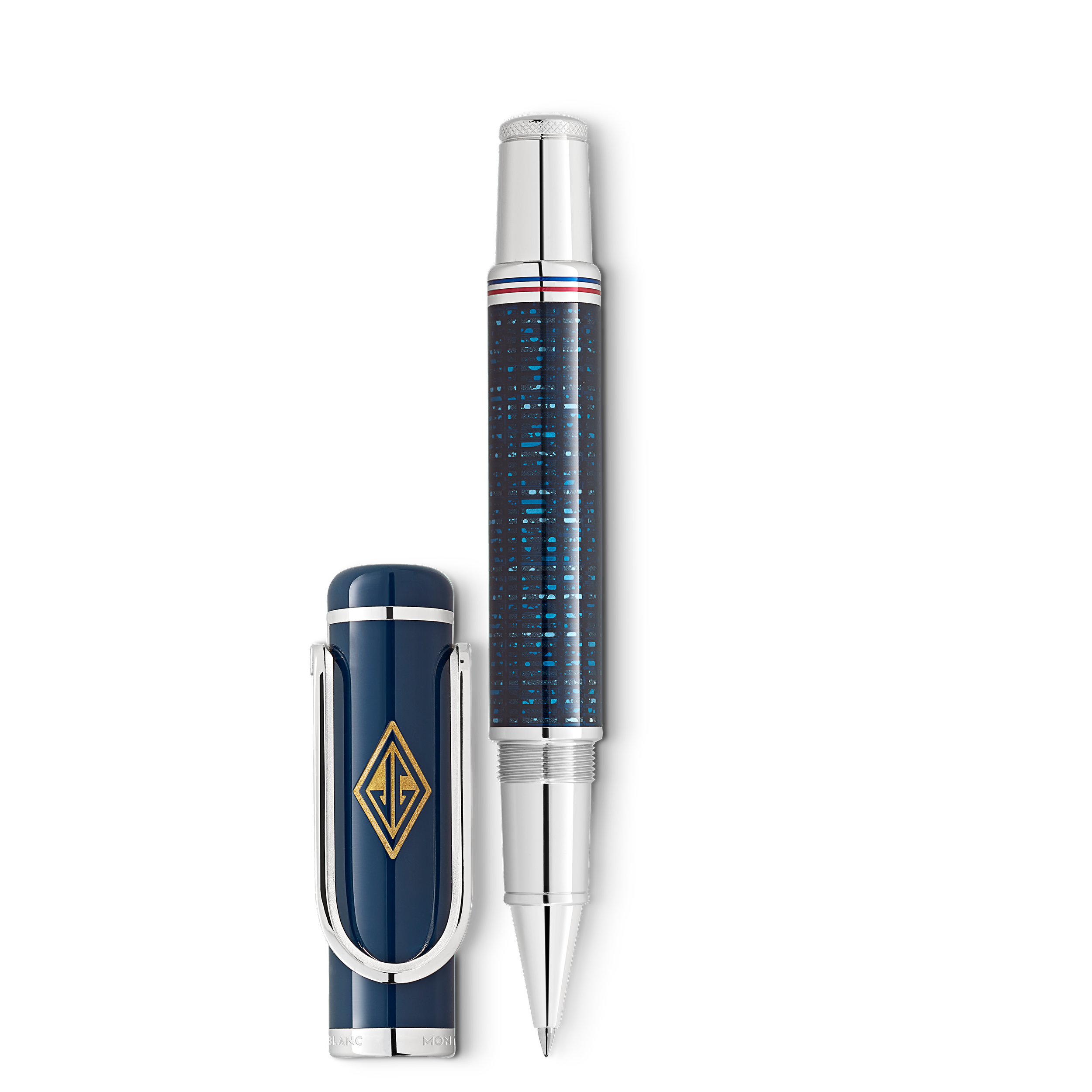 Einige Romane gehen in die Geschichte der Literatur ein und avancieren zu einem Symbol für eine ganze Epoche. Ein solches Juwel der modernen amerikanischen Literatur ist F. Scott Fitzgeralds „Der große Gatsby“. Der 1925 veröffentlichte Roman zeichnet das faszinierende Bild der verrückten Zwanzigerjahre und des Jazz-Zeitalters, einer Ära des neuen Wohlstands und der Maßlosigkeit. Vor dem Hintergrund der pulsierenden Metropole New York City, der großen Villen auf Long Island und glamouröser High-Society-Partys wird die Geschichte von Jay Gatsby erzählt, eines geheimnisvollen Millionärs, der nichts unversucht lässt, um seine verlorene Liebe Daisy Buchanan zurückzugewinnen. Das Design der Great Characters Hommage à The Great Gatsby Special Edition ist vom strahlenden New York der Gatsby-Zeit inspiriert, als leuchtende Art-déco-Wolkenkratzer in den blauen Abendhimmel ragten. Die Oberfläche des Korpus verweist auf ein frühes Schreibgerät von Montblanc aus der Zeit des Art déco. Sie wurde mit einer besonderen Technik erhalten und scheint die hell erleuchteten hohen Fassaden der pulsierenden Großstadt in der Nacht zu reflektieren. Das fluoreszierende Montblanc Emblem im Kappenkopf ist kein fiktionales Element, sondern leuchtet wie das grüne Licht am Dock von Daisys Haus im Roman „Der große Gatsby“. Tagsüber fängt es das Licht ein und speichert es, um in der Dunkelheit zu leuchten. Die allgegenwärtige Macht des Geldes wird in dieser Edition vom platinierten Clip symbolisiert, der in Form einer Geldscheinklammer gehalten ist. Die runde Öffnung zeigt die Initialen von Jay Gatsby in Form eines rhomboidischen, vergoldeten Art-déco-Monogramms. Die Legende des amerikanischen Traums und das Design der häufig stilvollen Flachmänner des Art Déco werden vom Konus aufgegriffen, der den gravierten Schraubverschluss eines Flachmanns nachbildet sowie die feinen Ringe in den Farben der amerikanischen Flagge, die ihn umgeben.