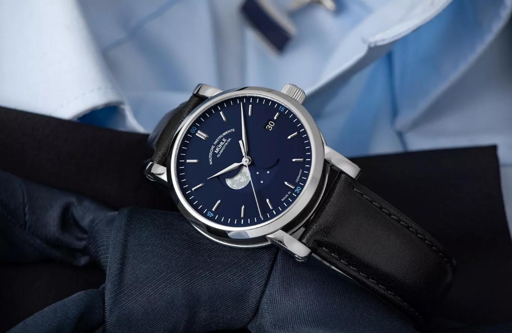 Der Name ist Programm: Die Teutonia IV BlueMoon verfügt nicht nur über ein nachtblaues Zifferblatt, sondern ist auch die zweite Teutonia mit Mondphasenanzeige. Dafür steht der Namenszusatz „BlueMoon“ – wie der zweite Vollmond eines Monats auch genannt wird.