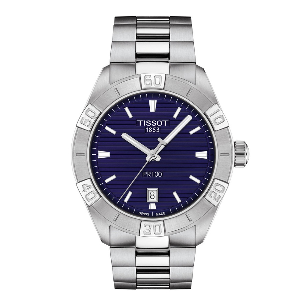 Direkt nach dem Business-Meeting ins Sportstudio oder vom Büro ohne Umweg auf die Joggingstrecke? Mit der Tissot PR 100 Sport Uhren Kollektion kein Problem! Sportlich und elegant gleichermaßen präsentieren sich diese in verschiedenen Ausführungen erhältlichen Zeitmesser. Ob als Chronograph oder Dreizeigeruhr, die hochwertige Komponenten wie das kratzfeste Saphirglas oder das Edelstahlarmband mit Faltschließe und Drückern sowie die Wasserdichtigkeit bis zu einem Druck von 10 bar (100 m) garantieren beste Alltagstauglichkeit. Mit ihrer großzügigen Gehäusegröße von 42 mm gehört sie zu den größeren Uhrenmodellen und sorgt für ein markantes Statement. Das Design ist robust und wunderschön stromlinienförmig zugleich und zeichnet sich durch die stärkere Lünette und das schlichtere Armband aus. Die Indizes und Zeiger der PR100-Kollektion besitzen eine praktische Leuchtbeschichtung für optimale Ablesbarkeit. Dieses Herrenmodell aus der Tissot PR 100 Sport Kollektion hat ein 316L-Edelstahlgehäuse und ein blaues Zifferblatt mit Indizes. Zu den Merkmalen dieser sportlichen Ausführung gehört ein Swiss Made Quarzwerk mit Batterie-Endanzeige, ein kratzfestes Saphirglas und eine Datumsanzeige. Das massive 316L-Edelstahlarmband hat eine Butterfly-Schließe mit Drückern.